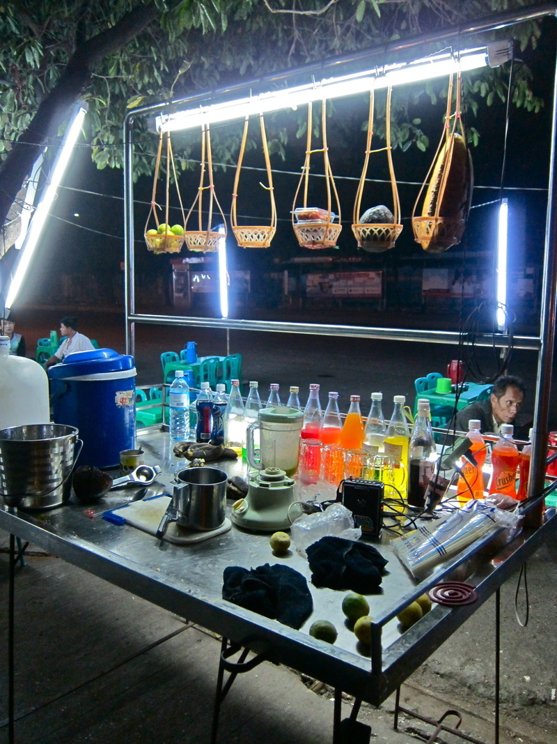 The fresh fruits that are available at the moment to be converted into juice are placed in wicker baskets and suspended from the metal bar to which the fluorescent lightbulb is attached. On tap tonight on this Yangon sidewalk: lime, strawberry, avocado, and/or papaya. Mixing and matching encouraged.
