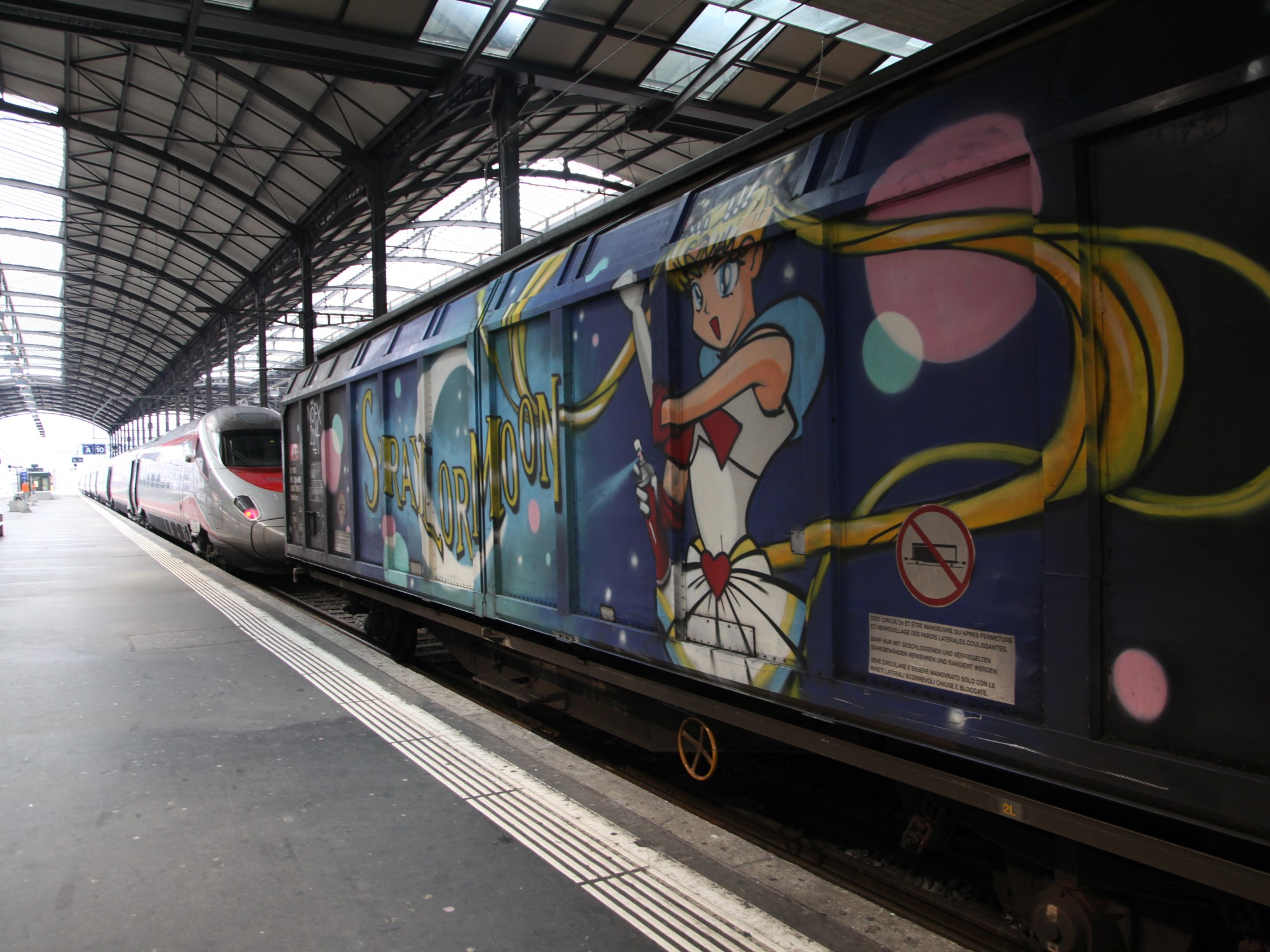 “Spraylor Moon” makes for a somewhat incongruous member of the not-particularly-colorful cast of characters/objects that populate the local train station here in Lucerne, Switzerland.