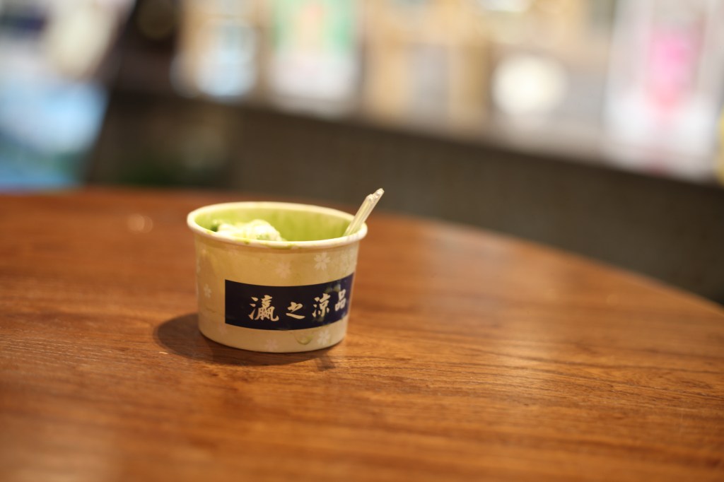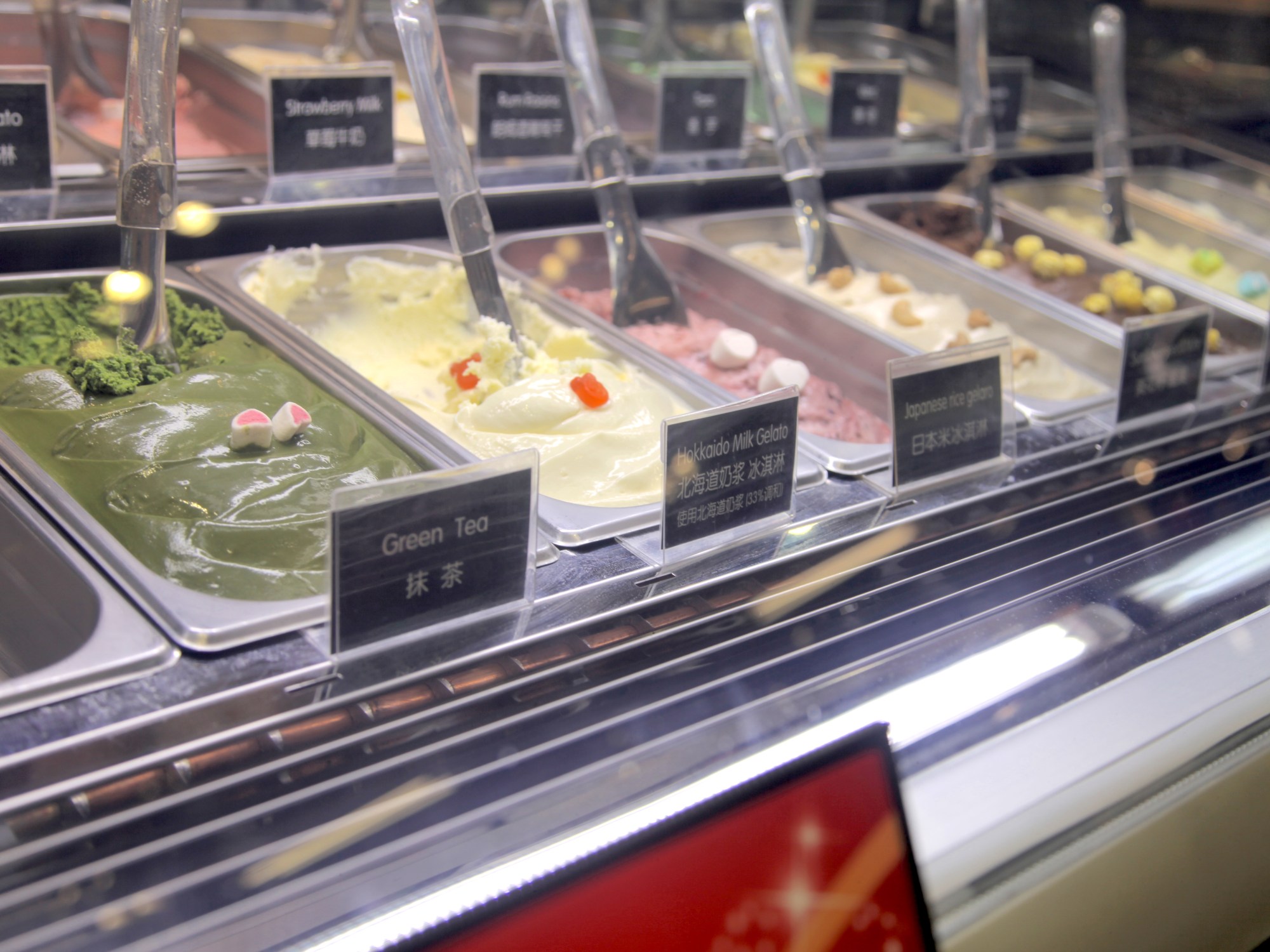 Behind the counter, uniformed servers sling “Japanese-style gelato” – including flavors such as “Hokkaido milk” “Japanese rice”, and “Green tea” – in creme-colored cups with white sakura-blossom print designs. Numerous other design touches in this tiny gelateria within a high-end Shanghai grocery store imply a strong connection of this stand’s products and techniques to Japan. Naturally, this stands in contrast with what Westerners are more used to believing as gelato’s “authentic” (read: Italian) origin story.