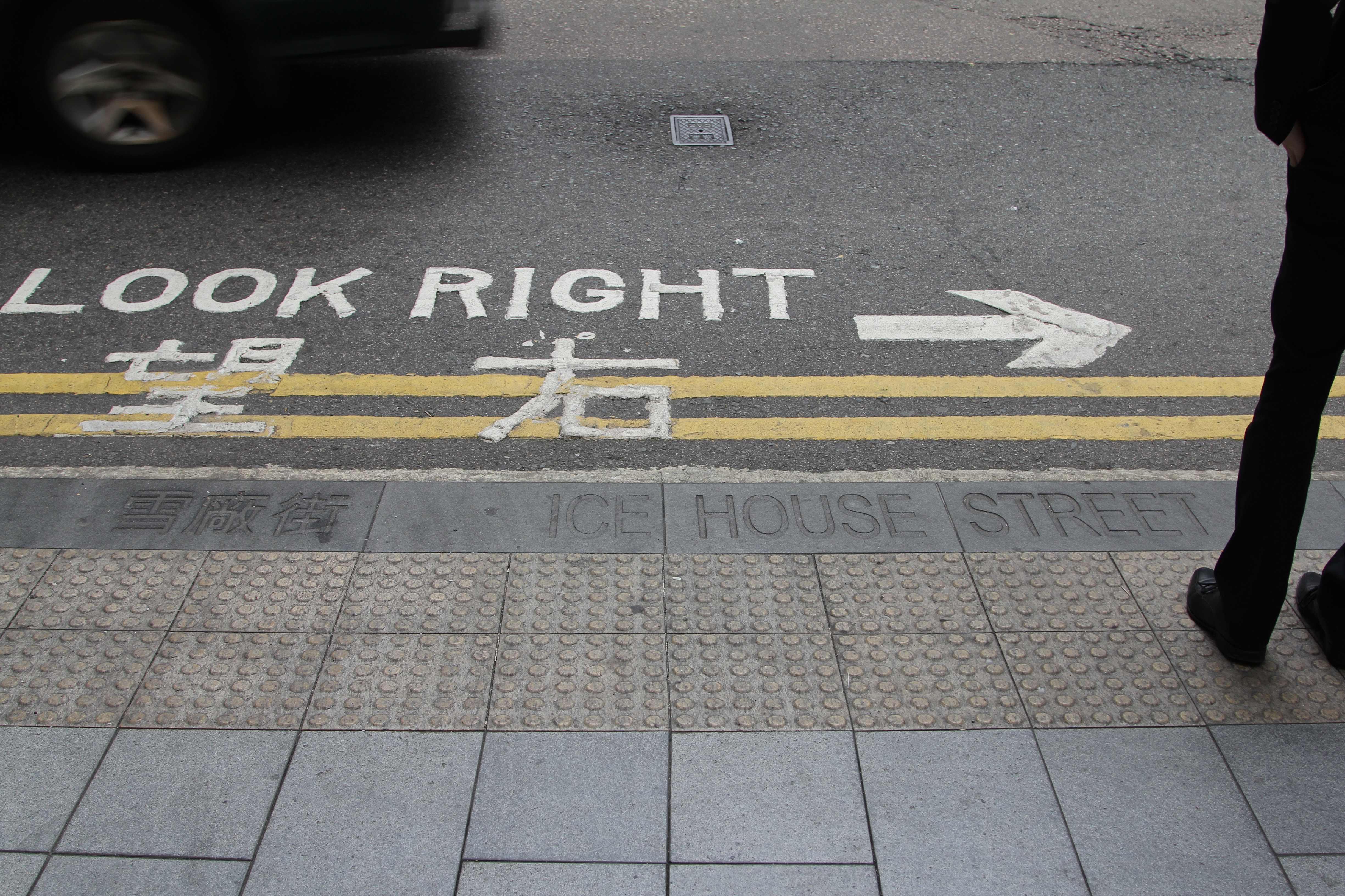 Accompanying the curbstones sporting street names are very helpful – possibly life-savingly so – reminders of which way one should direct one’s attention before attempting to cross the street. Useful, considering the brisk tempo at which the city’s sidewalks and streets move, and the fact that the rules of the road here are the mirror image of those in mainland China, just a handful of miles away over the border.
