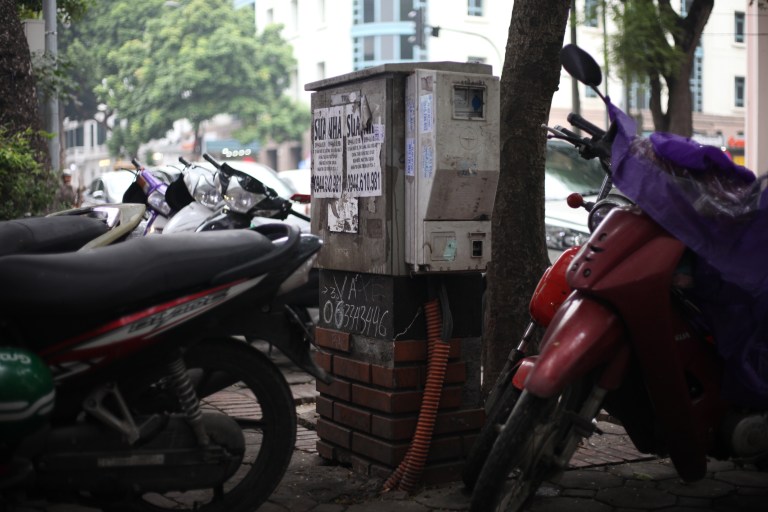 One pervasively advertised service seen on many of Hanoi’s transformer boxes is “vaxe” – air pumping. When not in motion at breakneck speeds down the city’s generous boulevards and tortuous alleys, Hanoi’s scooters tend to congregate in informal sidewalk-based parking lots. One need not look far from such a parking lot to find handwritten advertisements for adding air to deflated tires appear, meaning in most places across Hanoi where the sidewalk doubles as a scooter parking lot, it also often triples as an impromptu workshop for impromptu maintenance and basic repairs.
