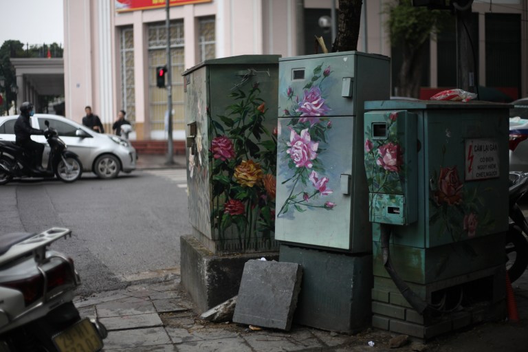 To what extent is the art meant to serve as decoration, done to beautify (or at least not detract from the beauty of) the adjacent property, and to what extent is it done to deter those in search of a street-level billboard space? Stickers of advertising posters do not appear hesitant to paste over each other’s advertisements in Hanoi, but art seems to be treated differently, perhaps claiming that a space has been “spoken for,” like it being frowned upon to tag over someone else’s graffiti with your own mark in New York City (or perhaps just being carefully cleaned and maintained by employees of the same entity that commissioned the boxes to be painted in the first place).