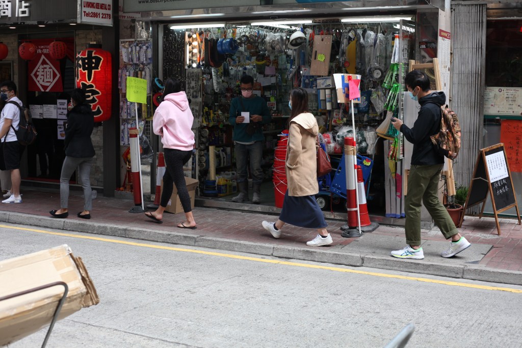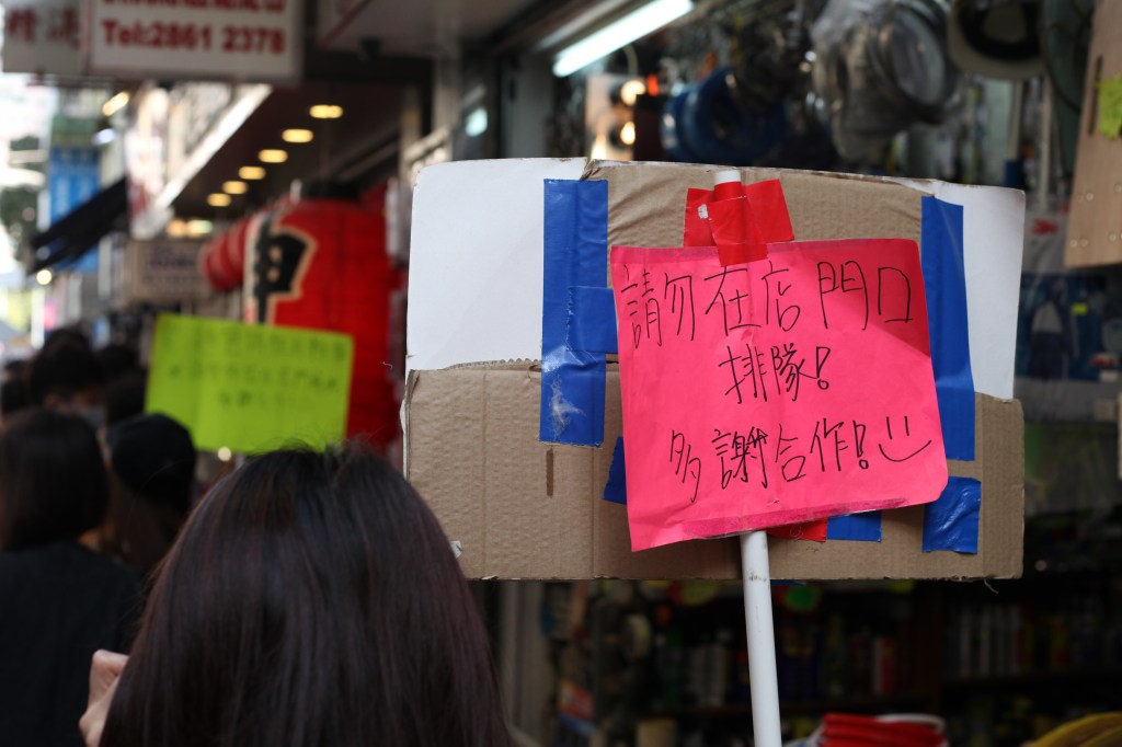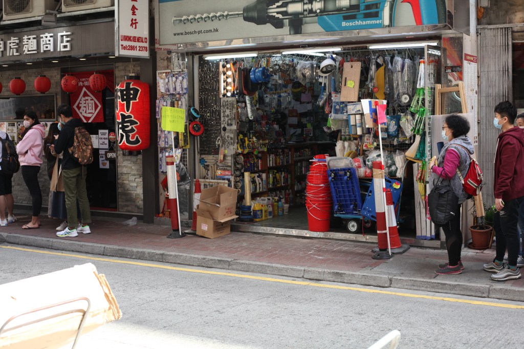 To claim space for more of his own customers and allow visibility for his storefront goods display, the owner of this construction material shop has improvised an intervention to reshape how people line up. An action that might feel aggressive or excessive elsewhere feels, in this dense section of Wanchai neighborhood, like an in-bounds reaction to the numerous design challenges presented by Hong Kong’s space constraints (and the smiley faces on the signs help as well).