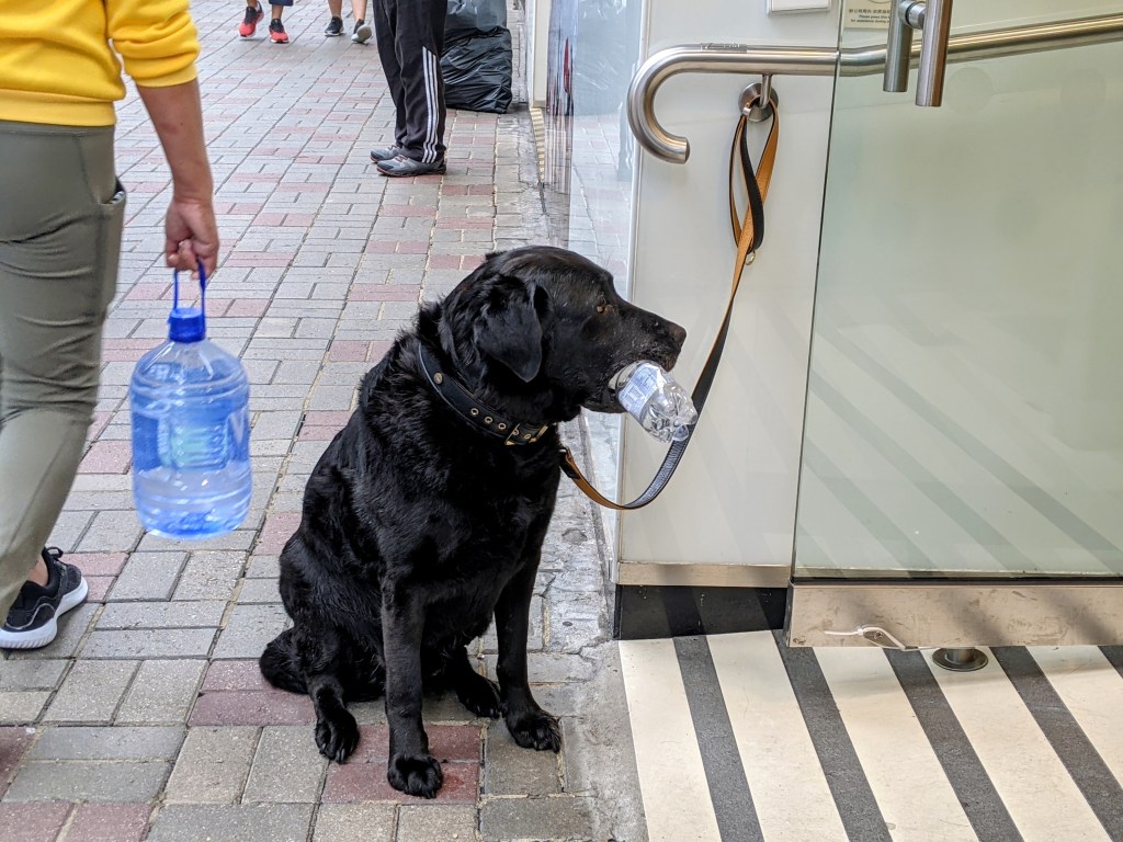 Thus, the novel canine behavior captured here; while it is already uncommon to find a dog who is so well behaved that they are willing to calmly sit and wait outside of a store for their owner, it is likely only in Hong Kong that that same dog will have been trained to carry a bottle of water in its mouth to assist with cleaning up after relieving itself (or at least making it easier for the owner by giving her or him one less thing to carry when they head out on a walk).