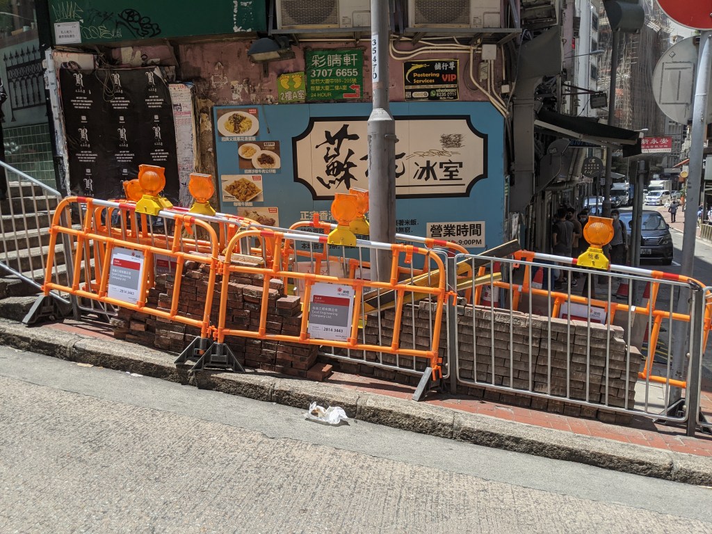 On the way to a nearby restaurant for a team lunch, we spotted one creative construction team’s solution for storing bricks directly on the sidewalk so that they take up the least possible amount of room – sandwiched into the negative space created by the ugly, grey metal sidewalk fencing and some safety barriers typically used for redirecting vehicular and pedestrian traffic. This creates quite a different outcome from the behavior captured in the last post that led to a temporary street-based park. By comparison, what this approach gains in preserving vehicular traffic flow, it loses in ability to spontaneously double as seating.