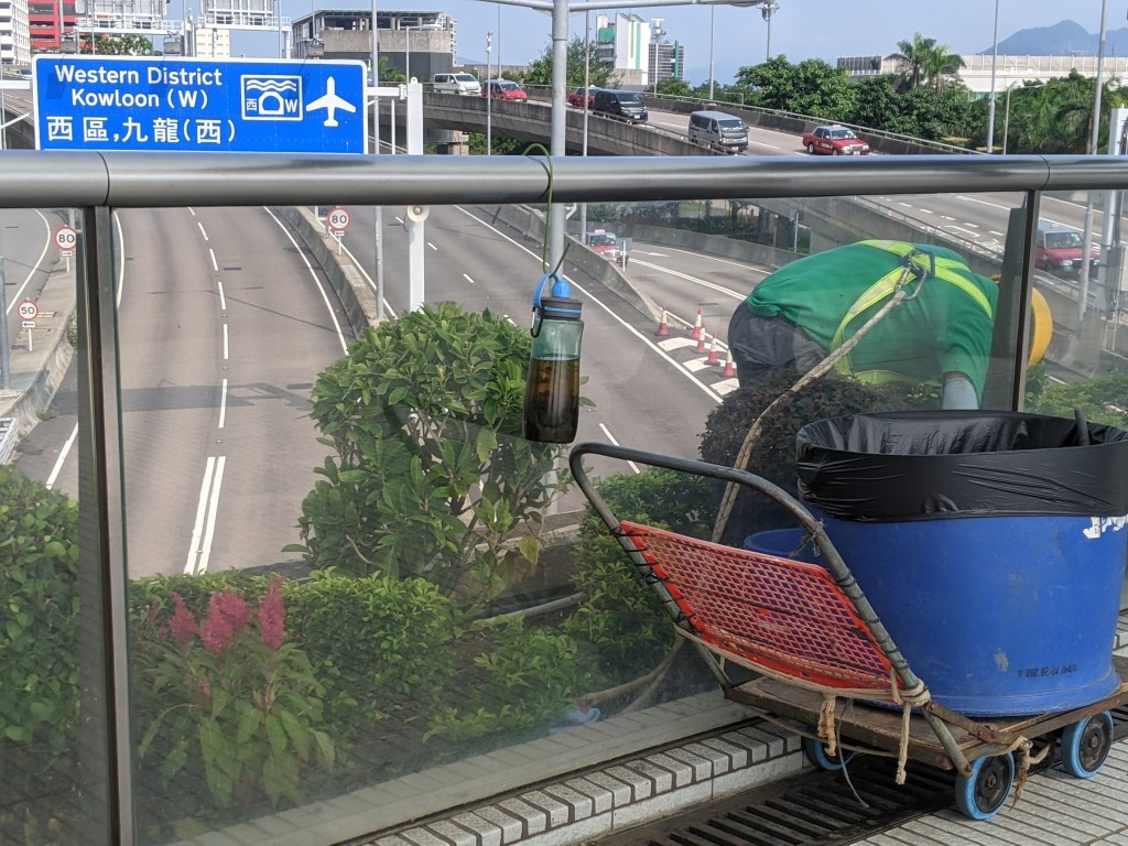 A wire clothes hanger is repurposed to hold a grounds worker’s tea as they maintain the greenery lining one of Hong Kong’s numerous elevated overpasses.