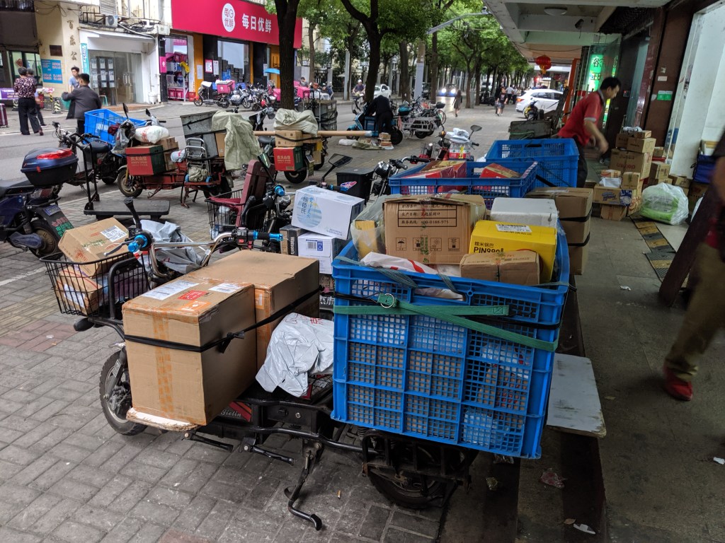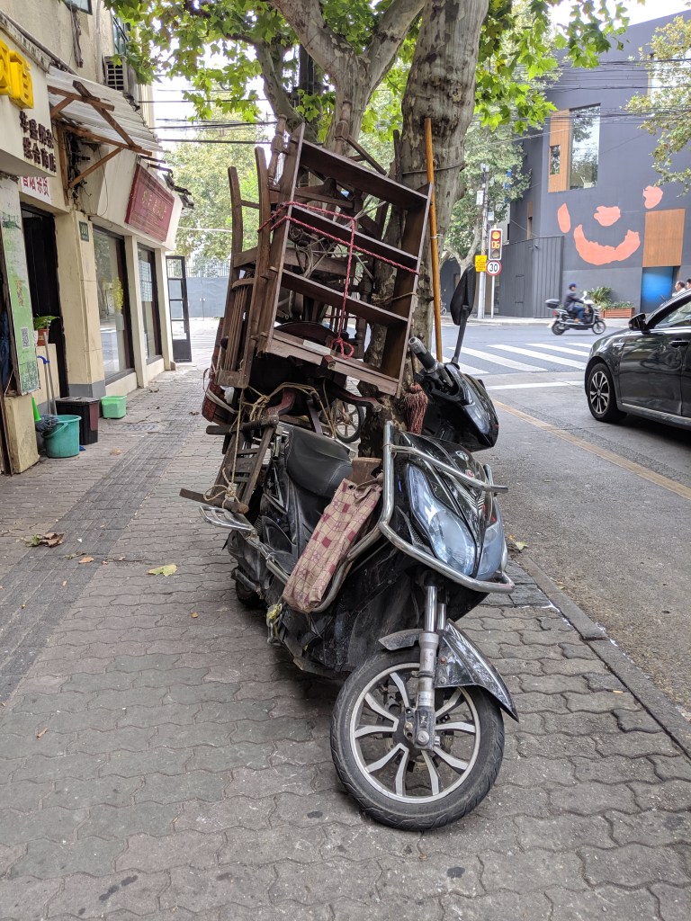 Now, as a city continually in the process of remaking itself, Shanghai is shifting from car- and human-scale to B.A.T-scale, as bike lanes swell with citizens’ app-mediated delivery demands. Step out on to almost any street in the city and it won’t be long before you spot a heavily loaded two-wheeled electric scooter. Many are equipped with improvised shelves and pannier-like appendages, loaded to optimize for cargo carriage capacity, and obscuring how a driver could even fit into the saddle (let alone steer and see which direction they’re headed in).