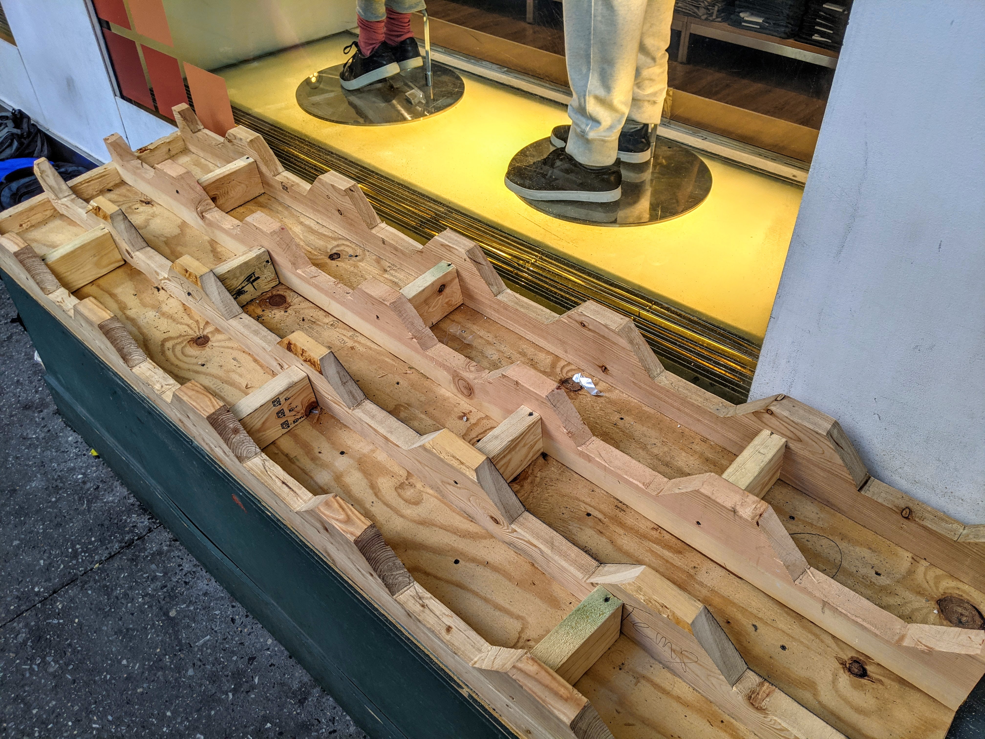 The usually welcoming and warm textures of wood, here used in a hostile architecture capacity to discourage and disable access to an otherwise public space adjoining the sidewalk.