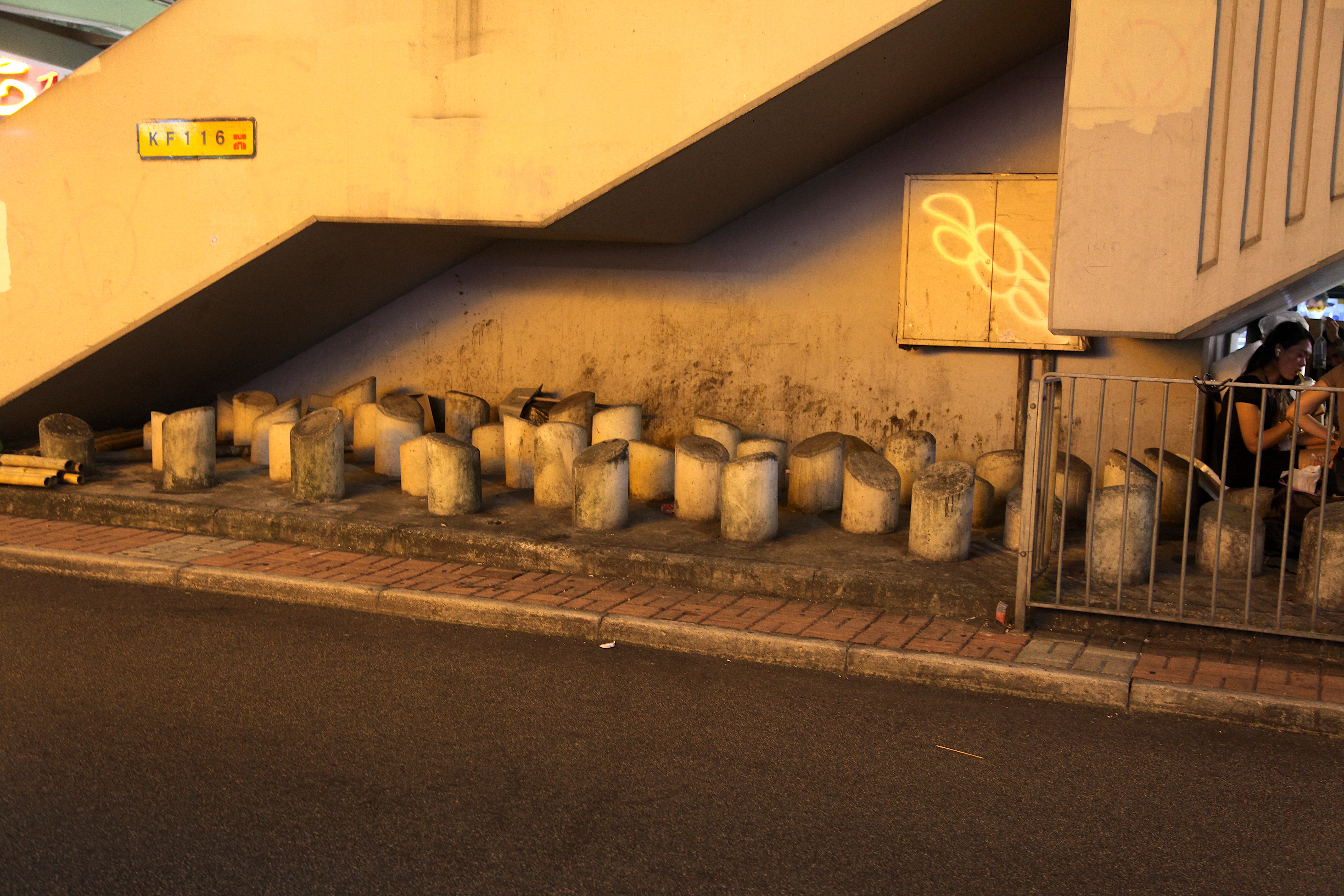 Of the handful we explored, I’m a particular fan of this one in the city’s Mongkok neighborhood – by one count the most densely populated neighborhood on the planet. By its hostile design/architecture pillars restricting motorcyclists from parking their rides there and homeless from “sleeping rough” beneath the stairs, these same menacing-looking pillars have unlocked an entirely different use.