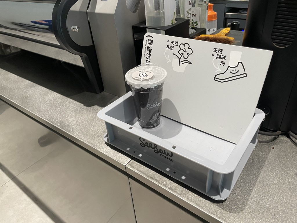 Seesaw Coffee, a (Shanghai-HQ’ed) chain of 17 cafes (as of this writing), offers free cups of their used coffee grounds in this branch of their store in Nanshan, Shenzhen. Useful for anyone interested in, as they claim, either a “natural fertilizer” 天然花肥 or a “natural deodorant” 天然除味剂.