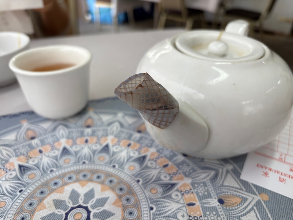 Though likely done without aesthetics in mind, they generate one all their own — a texture of care specific to the square inch of Hong Kong teashops. Plastic, wire, bamboo, ceramic — all stitched together in service of another meal, another pot, another day.